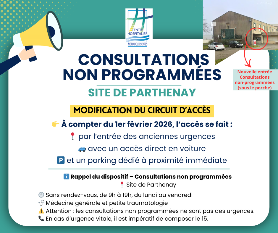 Le Centre Hospitalier Nord Deux-Sèvres (CHNDS) informe les usagers d’un changement de circuit d’accès aux consultations non programmées sur le site de Parthenay, qui sera effectif à compter du 1er février 2026 dans le but d’améliorer la lisibilité du dispositif et la fluidité du parcours patient.