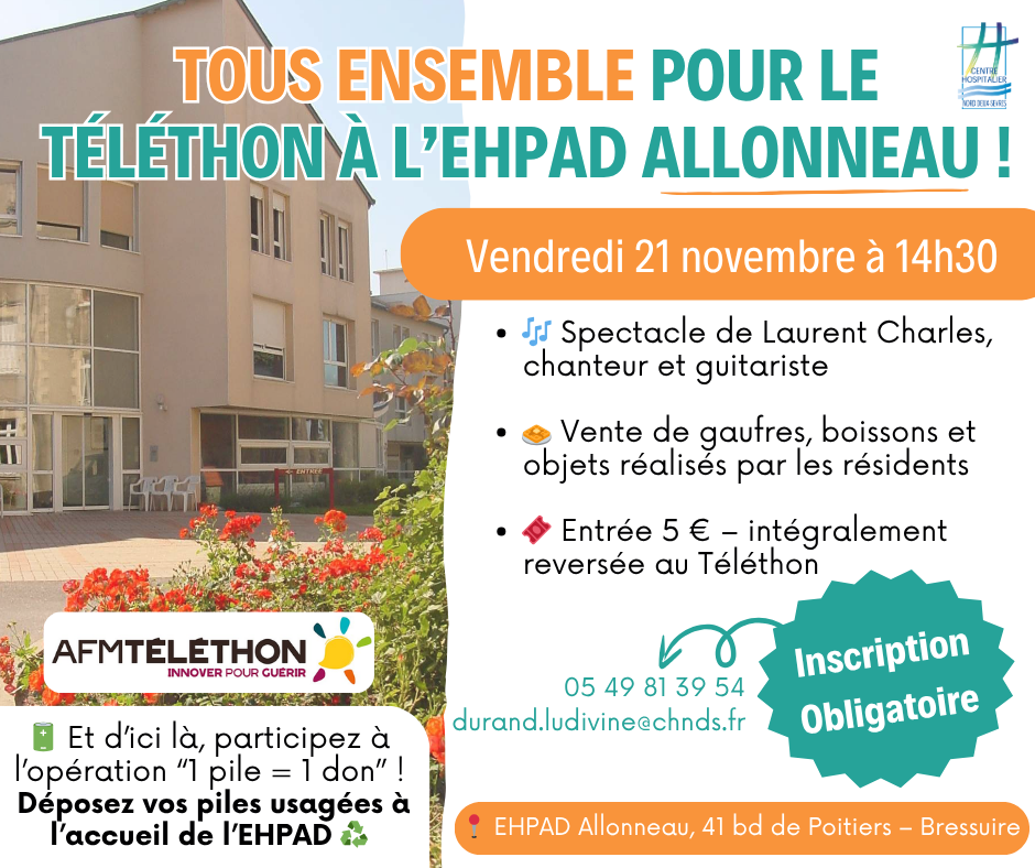 Le vendredi 21 novembre 2025, l’EHPAD Allonneau du Centre Hospitalier Nord Deux-Sèvres organise une journée d’action en faveur du Téléthon, placée sous le signe du partage, de la musique et de la générosité.