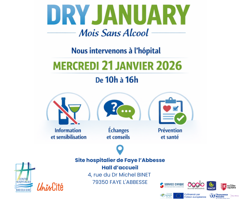 Dans le cadre du mois national Dry January, le Centre Hospitalier Nord Deux-Sèvres s’associe à l’équipe Re-Pairs Santé d’Unis-Cité pour mener une action de prévention et de sensibilisation autour de la consommation d’alcool.
