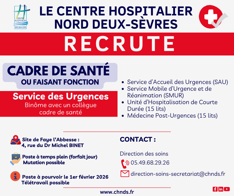 Le centre hospitalier nord deux-sèvres recrute un(e) cadre de santé pour le service des urgences :