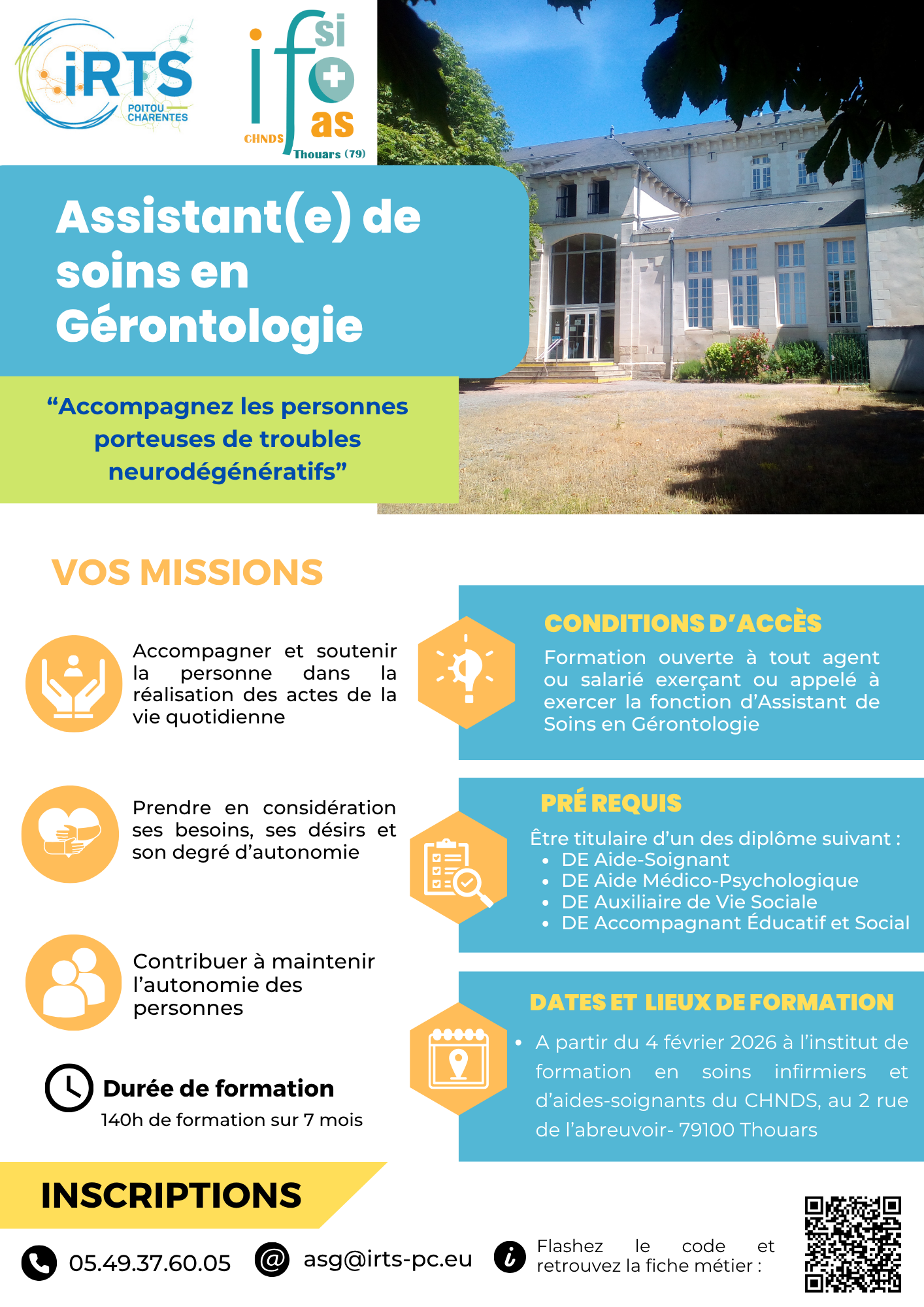 Nouveauté 2026 : La formation « Assistant de Soins en Gérontologie (ASG) » se réalise sur le territoire Nord Deux-Sèvres dans les locaux des instituts de formation en soins infirmiers et d’aides-soignants du CHNDS au 2 rue de l’abreuvoir à THOUARS (79).