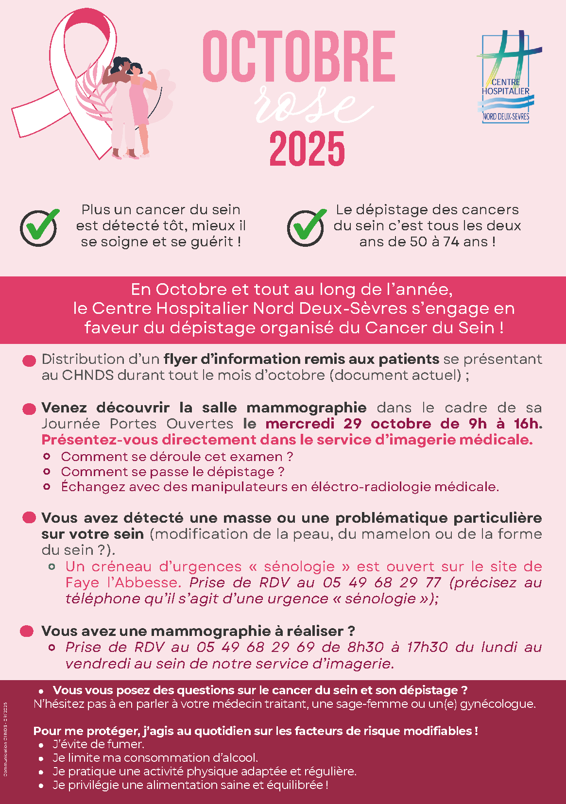 Au Centre Hospitalier Nord Deux-Sèvres, nous sommes au rendez-vous pour informer, sensibiliser et rappeler que le dépistage, c’est toute l’année.