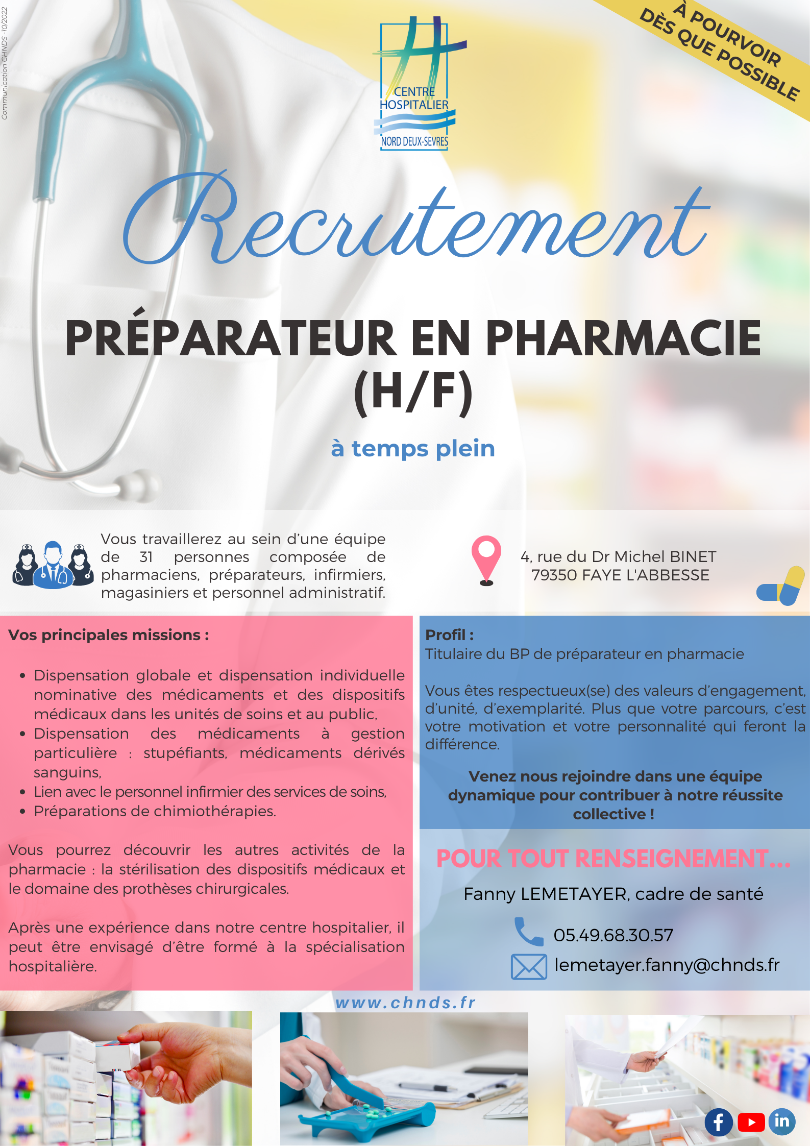 Le Centre Hospitalier Nord Deux-Sèvres, à Faye l’Abbesse (79), recrute un préparateur en pharmacie (H/F) à temps plein sur son site de Faye l'Abbesse (contrat long terme envisageable).
