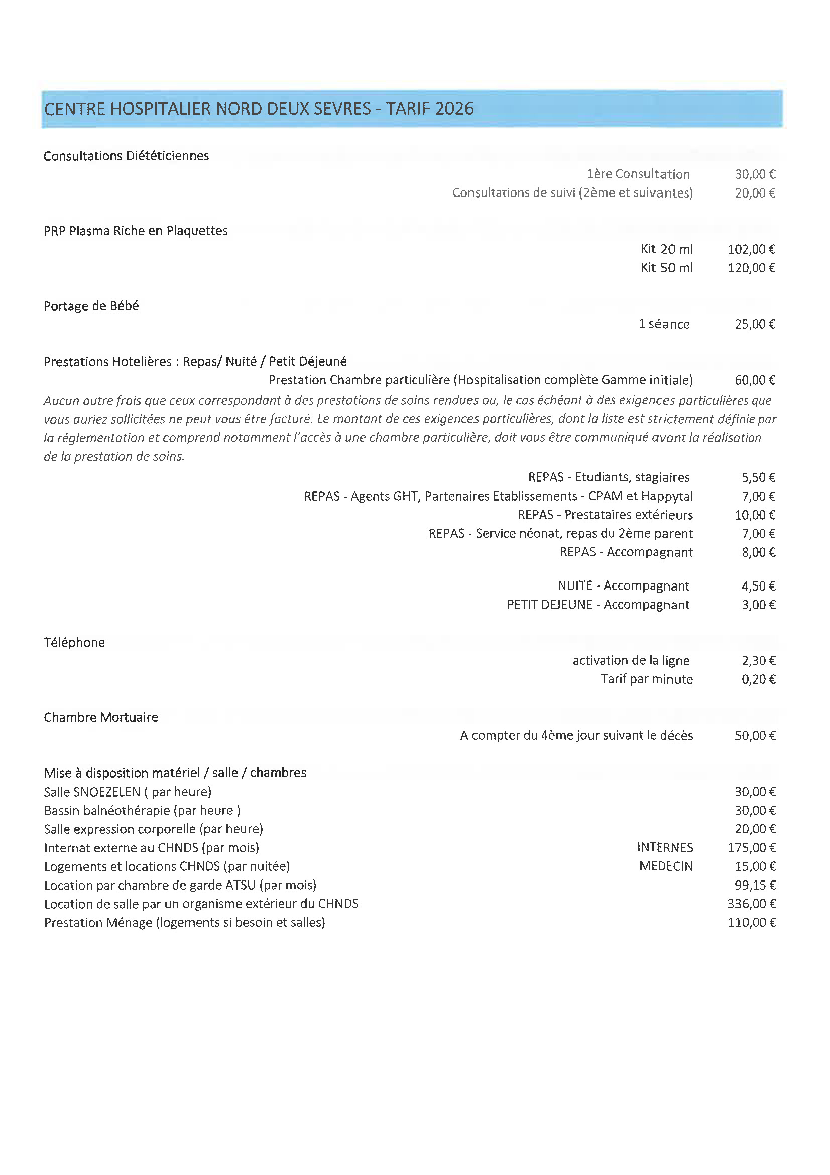 Tarifs de l'année 2026, applicables à compter du 1er